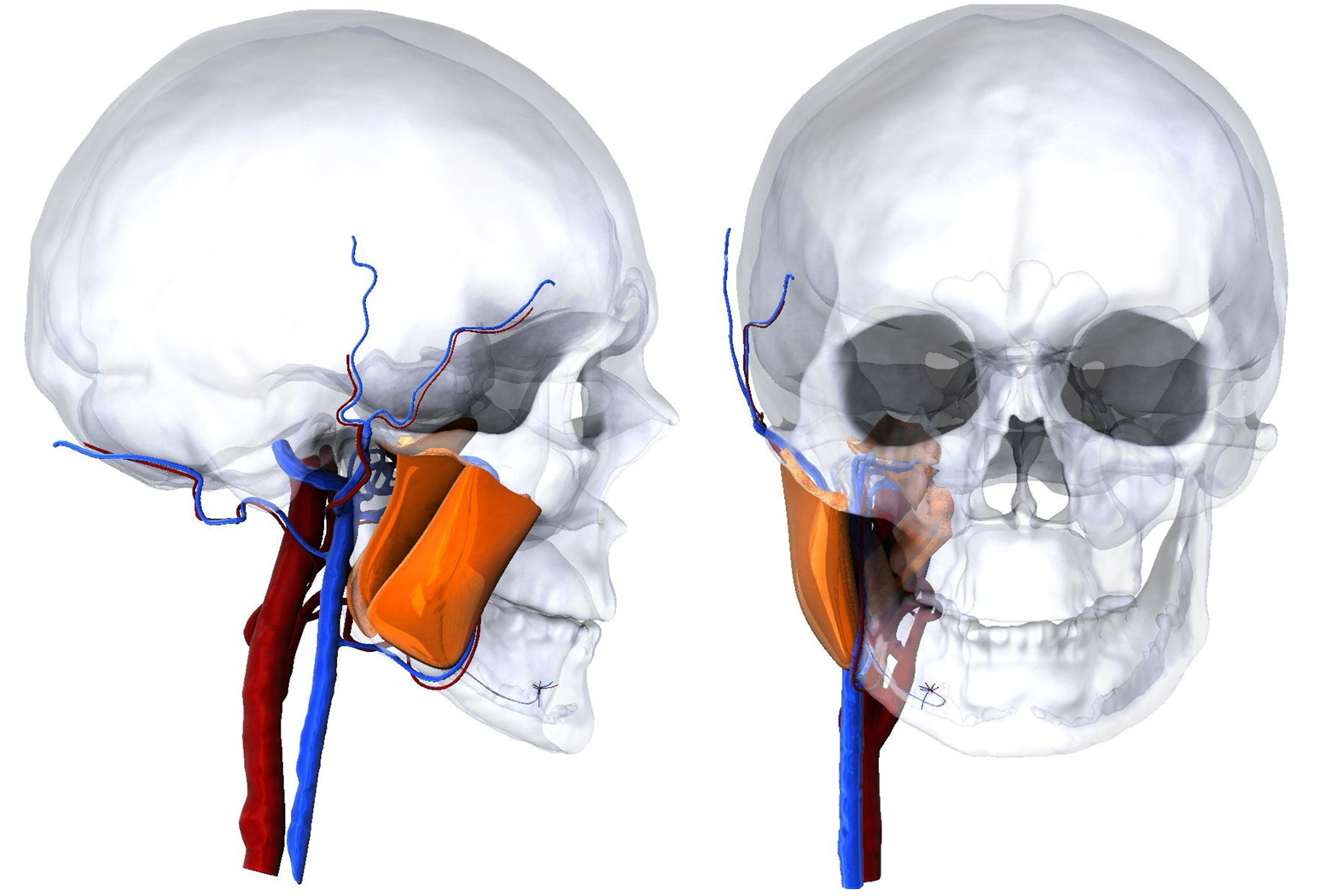 Специалисты «Авинекс» на основе данных компьютерной томографии построили высокоточную 3D-модель головы с трассировкой сосудов и нервных каналов. Проведён анализ подвижности челюстных сосудов в рамках стоматологического исследования для определения безопасного угла раскрытия челюсти при введении анестезии. Результаты исследования применяются в стоматологии для повышения точности и безопасности медицинских процедур