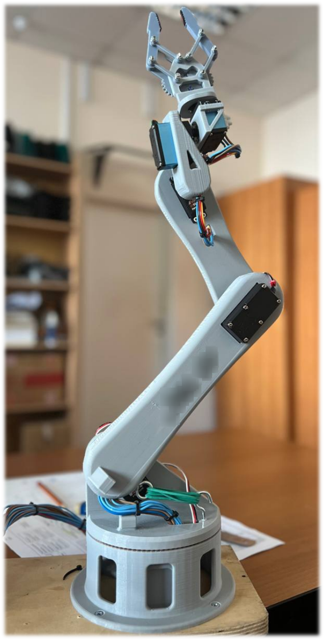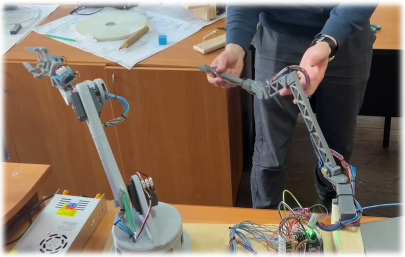 Разработали копирующую систему управления роботом-манипулятором (7 степеней свободы) на базе полунатурной модели из фотополимера и PLA-пластика. Решена обратная задача кинематики — как аналитически «на бумаге», так и в программной среде Motion Analysis. Для обеспечения плавности и стабильности работы реализованы фильтр Калмана и ПИД-регулирование актуаторов. Система успешно отработала в испытаниях и может быть масштабирована для промышленных манипуляторов, обеспечивая интуитивное и точное управление в реальном времени